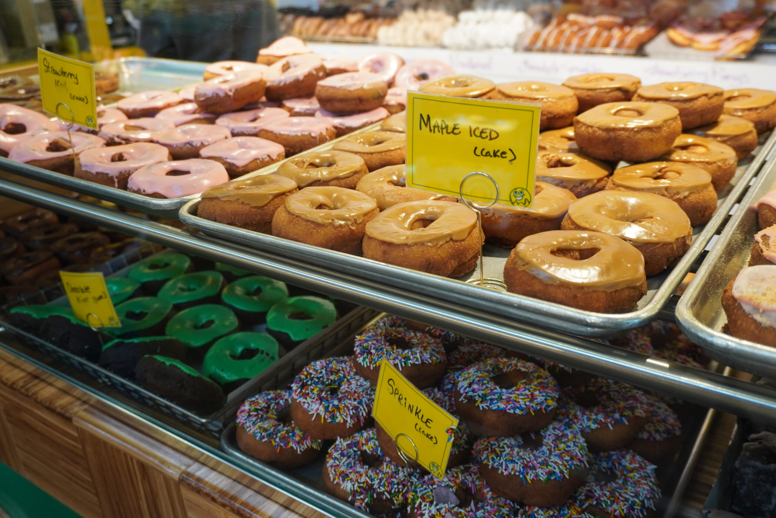 Granville Island ist eine kleine Halbinsel, in der es einen tollen Farmers Market gibt und super viele Essenstände. Natürlich snackten wir uns etwas durch und probierten unter anderem in Ahornsirup getränkten Räucherlachs und fühlten uns kanadischer denn je… 😉 Auch an den schon fast weltberühmten Lee’s Donuts konnten wir nicht einfach so vorbeigehen, da wir diese ebenfalls in guter Erinnerung hatten.