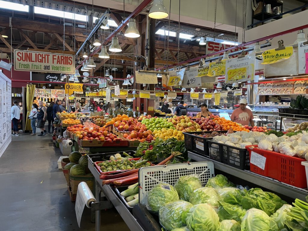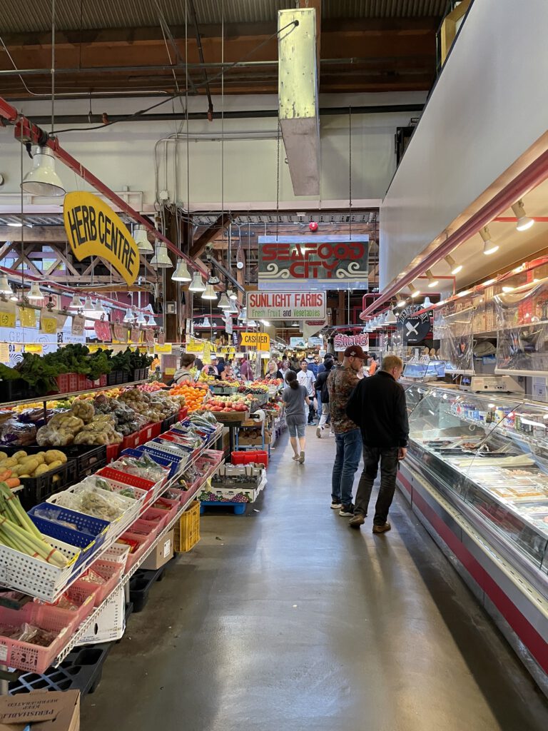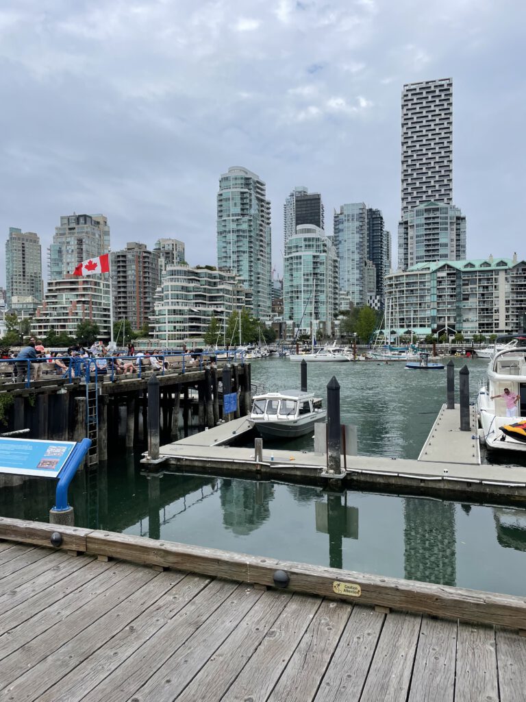 Jetzt ging die Mission los, die Eltern wachzuhalten. Also buchten wir uns ein Uber (so ne Art privates Taxi) und fuhren nach Granville Island. Hier schlenderten wir durch den Farmers Market und schauten uns schon mal die Skyline Downtowns von dort aus an. Wir aßen ein paar Smoked Maple Salmon Bites und genossen das gute Wetter am Ufer des Pazifiks.